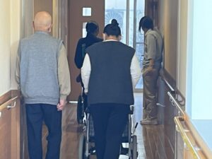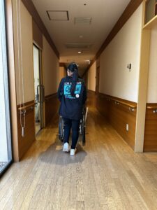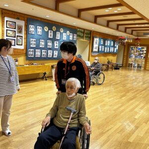 実際に利用者の方々が乗る車椅子を押して施設内を移動するお手伝いをしてもらったり、