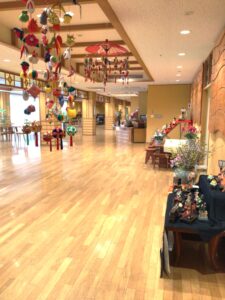 とても貴重な雛飾りや、利用者さん制作のつるし飾り、頂いたお花とともに展示しています。