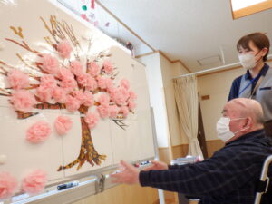 ゲームでは、利用者様に花紙で作って頂いた桜を枯れ木に投げ、ホワイトボードに満開の桜を咲かせました。