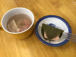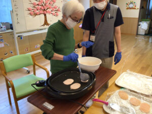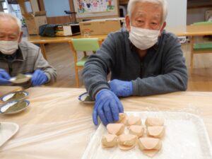女性利用者様も含め、男性利用者様も腕を振るい、完成した桜餅の中身の果物は「何かなぁ?」とドキドキしながら、みんなで「いただきます♪」